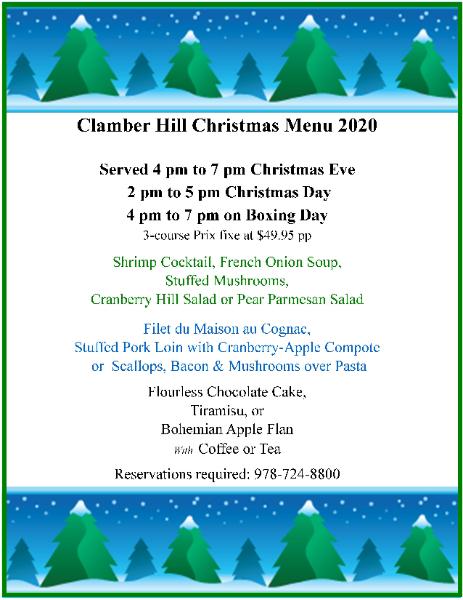 Restaurant Hours for the 2020 Holiday Season Christmas weekend we will be open with our special holiday menu (no regular a la carte menu) and special hours. We are happy to book holiday parties and family dinners any night in December, but please remember we are operating under MA Covid-19 requirements. No cocktail hours, no buffets, no more than 6 people at a table. Call us to discuss possibilities. Print menu here |
