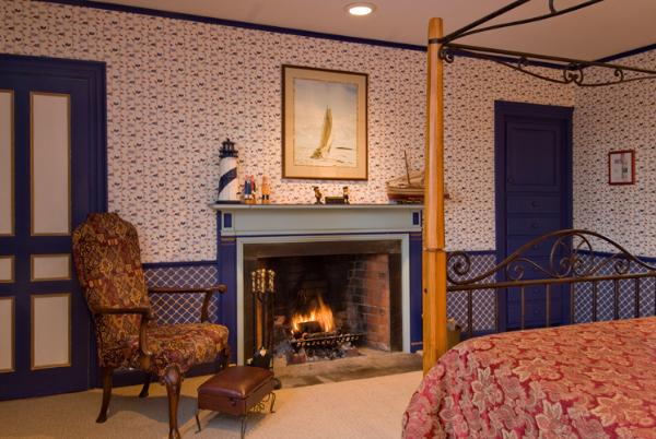 Clamber Hill's Nautical Room is the coziest room in this romantic country inn, with the working fireplace right \at the foot of the bed. This quiet second floor guest room is decorated in a Nautical theme complete with ship models, sea shells, artwork, lighthouses and even an old lobster trap collected from the Cabot Trail in Nova Scotia. The guest room is furnished with a four-poster queen-size bed and two comfortable chairs so guests can relax and enjoy a good book. Falling asleep with a blazing fire at the foot of the bed is one of life's romantic pleasures. The private bath is large and sunny also decorated in a blue and white nautical theme. This is another room great room to choose for the Romantic Get-away Package. Book Now |
