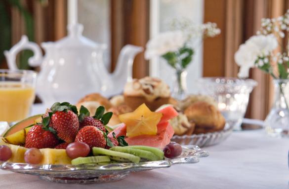 At a B&B, breakfast is included in your room rate, but not all breakfasts are equal! Here at Clamber Hill, a full gourmet breakfast is what makes this Inn famous. Breakfast is served in our Dining Room or Wintergarden from 7 am to 9 am each day. We have a Keurig for our early risers. At Clamber Hill breakfast is a grand, leisurely 2- course gourmet affaire, starting off with a choice of juice, a spectacular plate of fresh seasonal fruit, & fresh baked goods from the Clamber Hill kitchen. We rotate the first course with a variety of different breakfast breads, such as muffins, cinnamon rolls, scones and popovers because variety is the spice of life! All this is still followed by the main course, of course! If you're staying with us multiple nights, we try not to serve the same thing twice unless you get hooked on a favorite. If you do get hooked on one of our wonderful recipes and want it the next day or the next time you come to stay -- please remember that it's your job to let us know ahead of time! For the main course and we always give you two options. Farm Fresh Eggs "Cooked to Order" (fried, scrambled, soft boiled, poached, etc) or the Chef's Special of the day. Again this option always varies among our many pancake, crepe, French toast or waffle recipes. And both options always come with breakfast meats! Our original Pear Almond Pancakes won a semi-finalist award in the national BedandBreakfast.com Pancakes with Personality contest. We have gotten quite good at accommodating special needs, so if you have food allergies or dietary restrictions, please let us know in advance. And of course to top it all off we serve a bottomless cup of freshly brewed coffee, decaf or tea! Enjoy! |